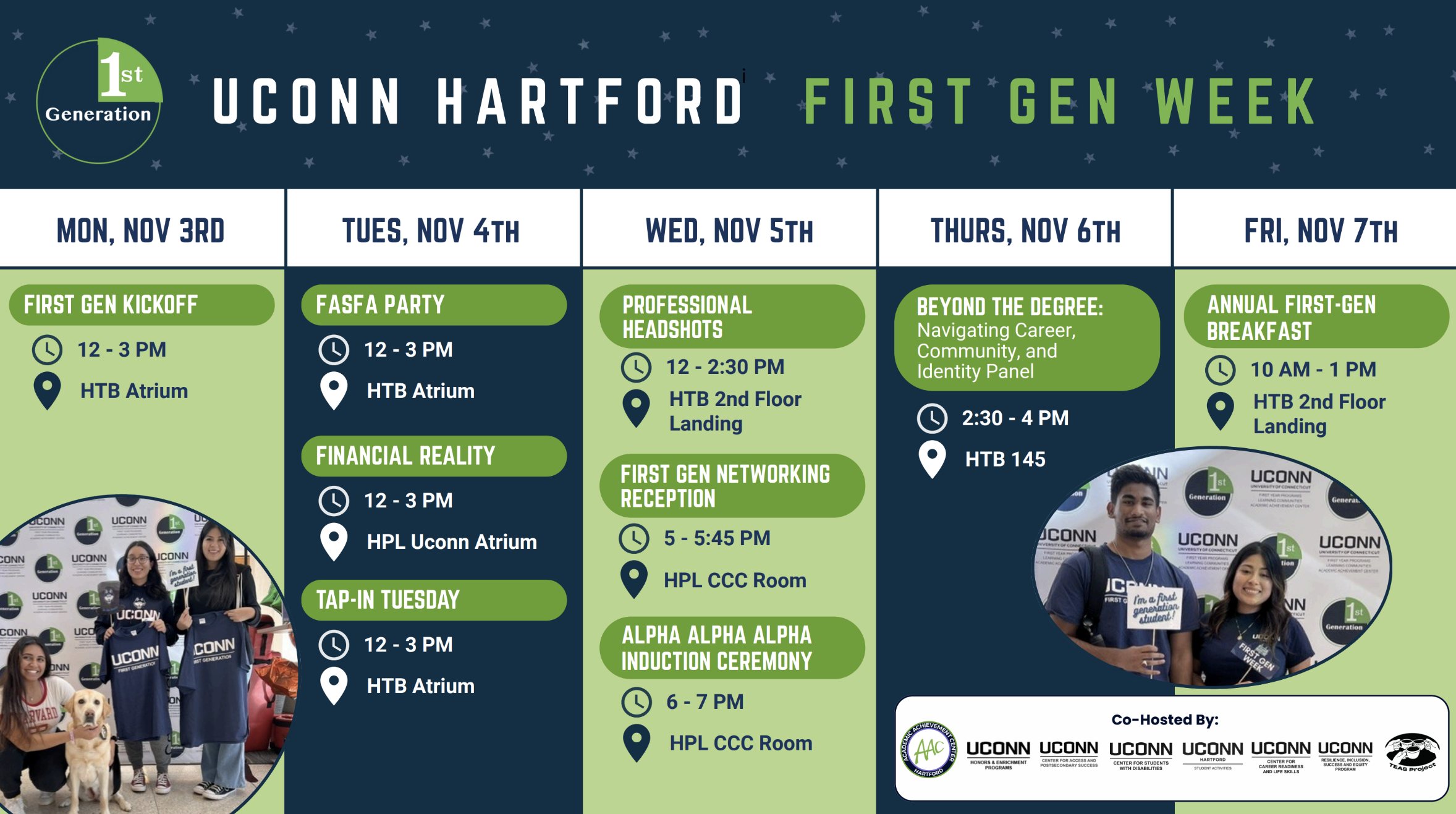 New and exciting events happening all week across UConn's campuses celebrating our First Gen population! Below is the schedule of events for 2025: